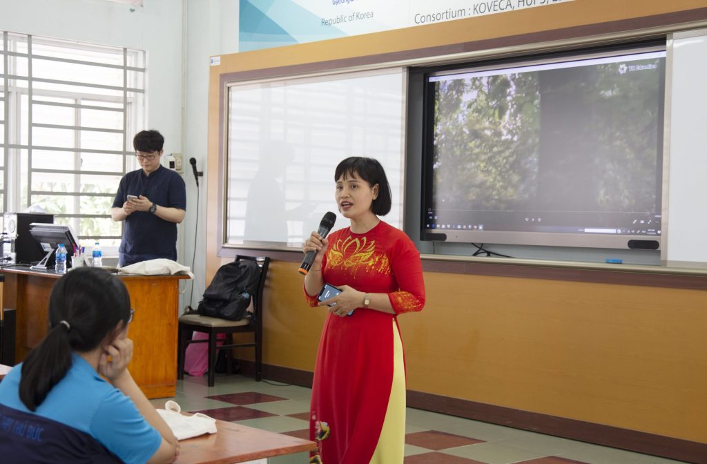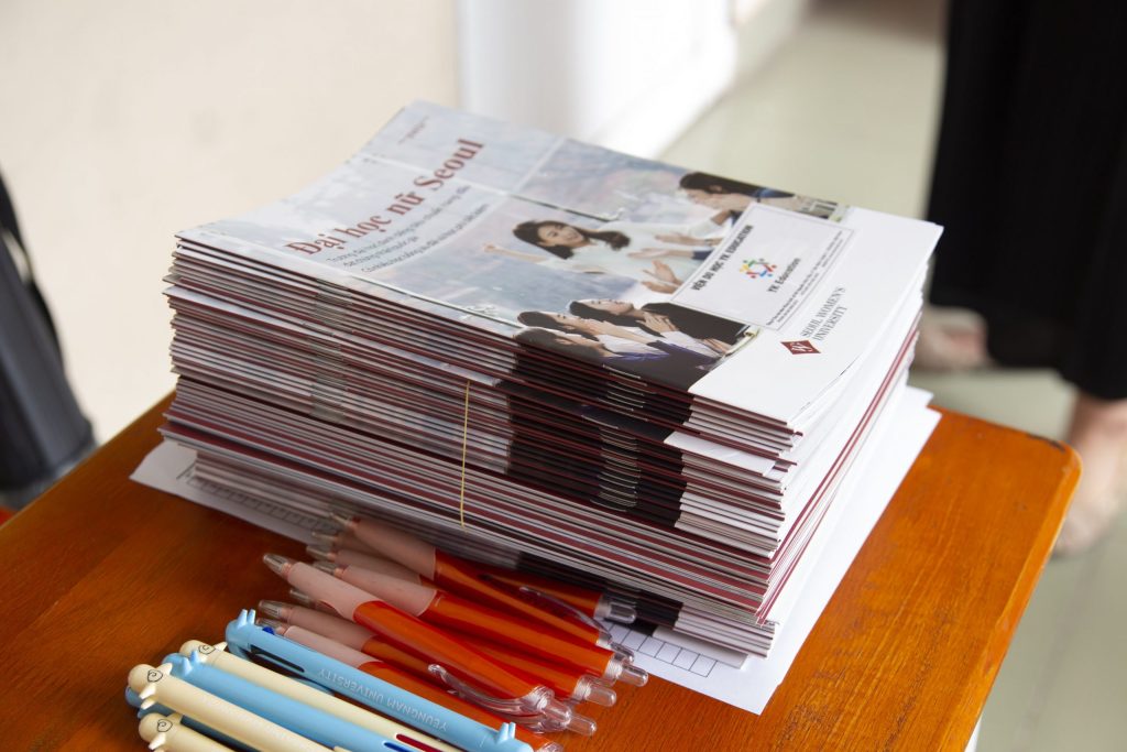 Các bạn học sinh vô cùng hào hứng, lắng nghe chăm chú Thầy giới thiệu về trường cũng như các chương trình học, học bổng tại trường. Các bạn còn biết đến cả Lee Bo Young – nữ diễn viên nổi tiếng tốt nghiệp trường Đại học Nữ Seoul.