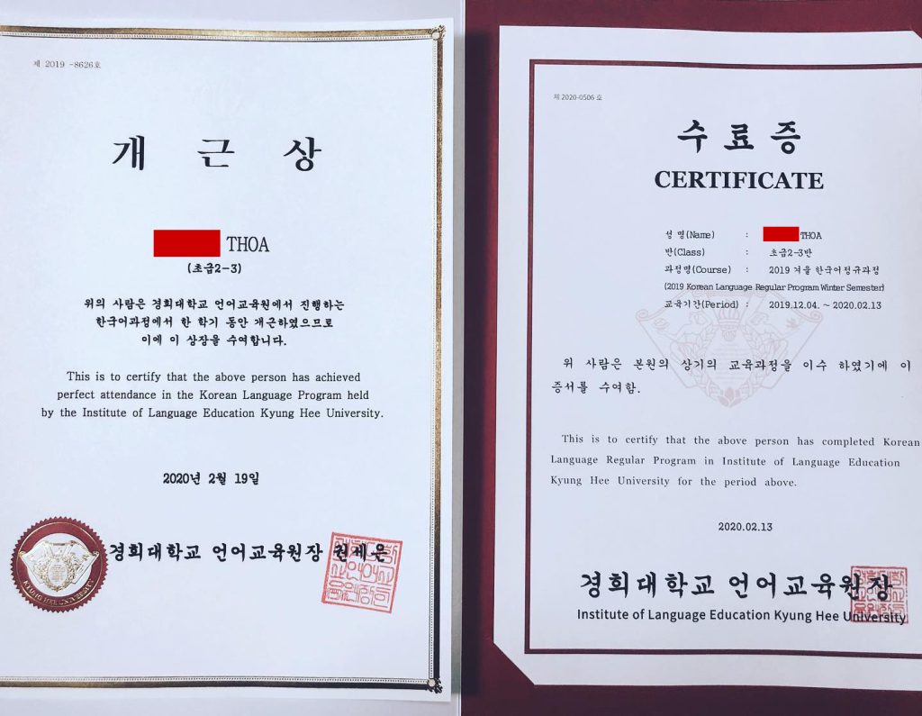 Chỉ mới nhập học không lâu mà học sinh của YK đã nhận được học bổng chuyên cần của Viện Giáo dục Ngôn ngữ – Trường ĐH Kyunghee rồi.️?️