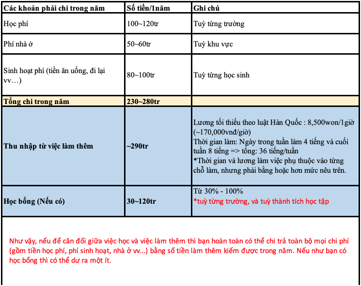 Sau đây sẽ là bảng tổng kết khoảng thu chi trong vòng 1 năm các bạn ở Hàn nhé: