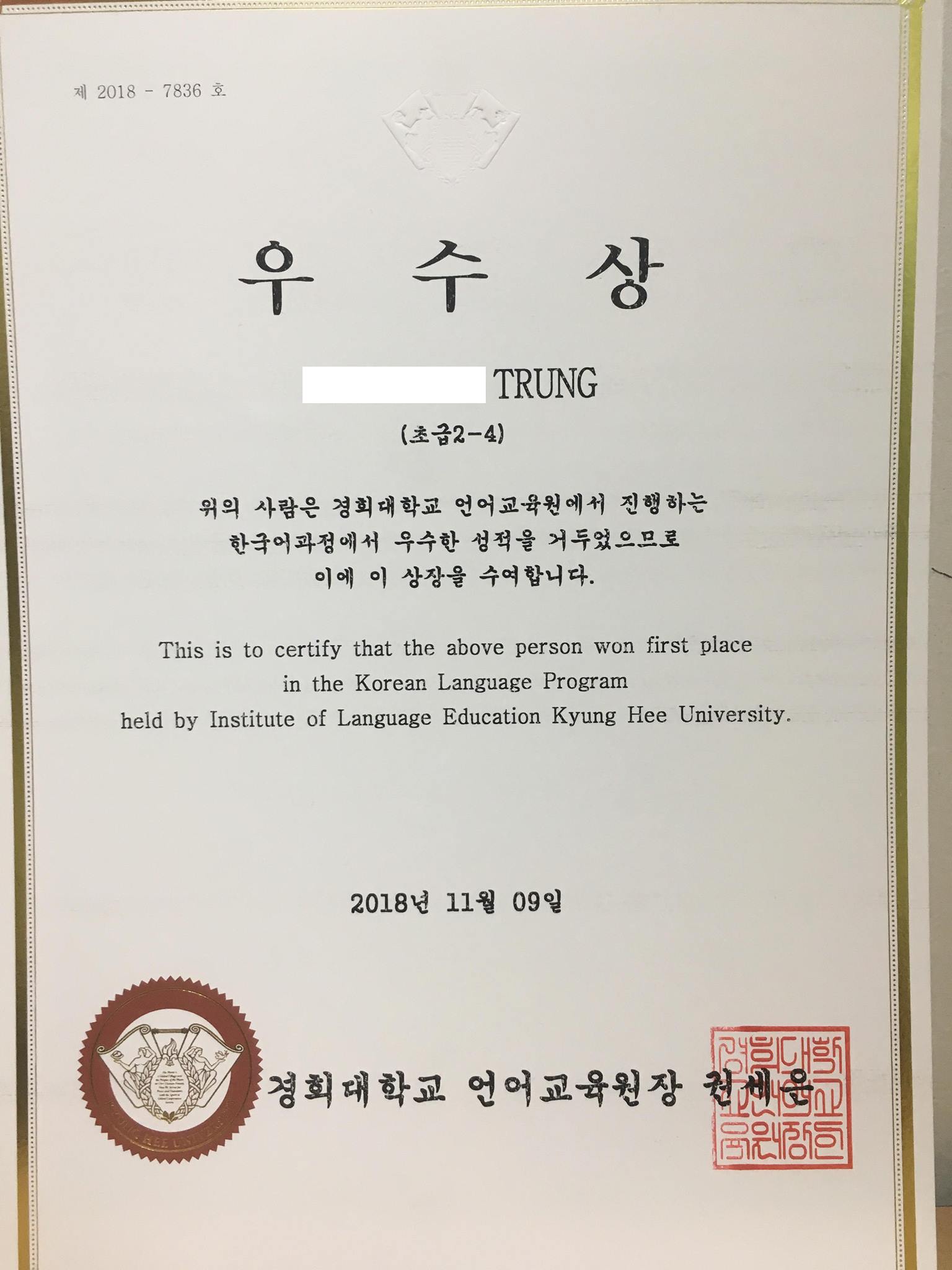Em thật sự biết ơn cô Yoon và sự giúp đỡ tận tình của YK. Về việc học tập tại trường đại học Kyung Hee thì em chỉ có 1 cụm từ để diễn tả: “ quá xuất sắc”. Từ môi trường học tập đẳng cấp củng như phương pháp giảng dạy vô cùng dễ hiểu của giáo viên và đặc biệt là những học bổng giá trị thì Kyung Hee là một trường đại học xức đáng để các bạn tìm hiểu để học tập.”?