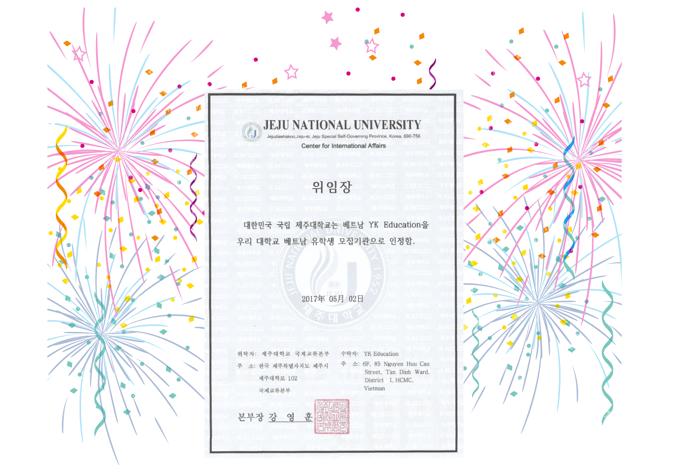 Các bạn ơi! Hôm nay 16/05/2017 YK vừa nhận được Giấy chứng nhận Tư cách Tuyển sinh cho chương trình tiếng Hàn của Đại học JEJU 2017 nè!