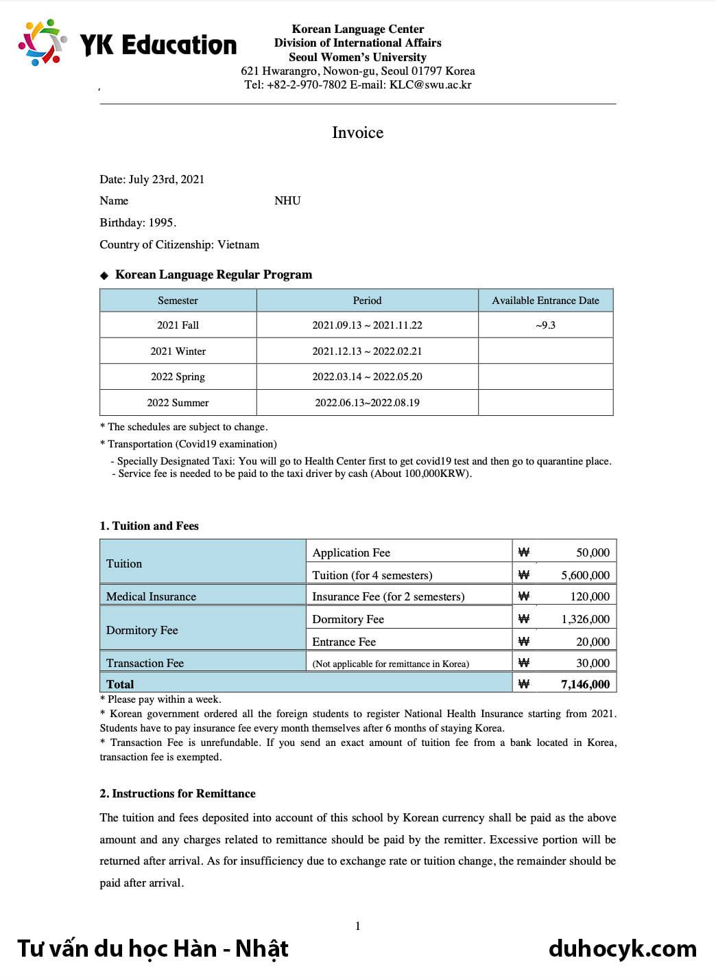 Xin chúc mừng bạn Quỳnh Như – cô bạn xinh xắn của học kỳ mùa Thu lần này ?????. Chúc mừng bạn đã nhận được invoice từ Trường ĐH Nữ sinh Seoul nhé. ?? Bây giờ chỉ còn chờ ngày xách vali lên và đi thôi nè ?